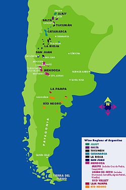 • Patagônia com destaque para as sub-regiões de Neuquen e Rio Negro, região mais Austral do mundo produzindo vinhos. É daqui que estão saindo alguns dos melhores vinhos elaborados com as uvas Pinot Noir e Sauvignon Blanc, cepas que gostam do frio.