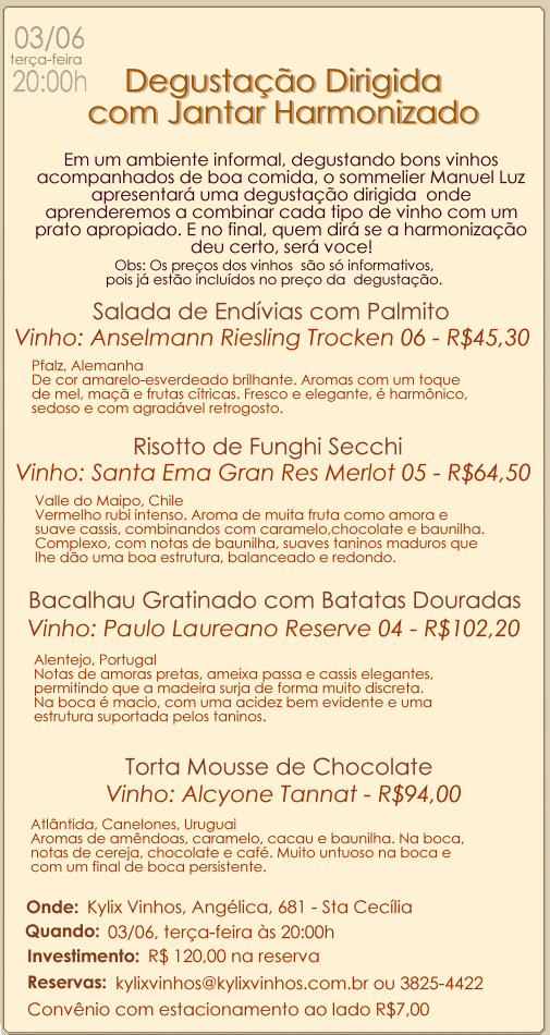 Outra das boas, é a degustação dirigida e harmonizada que o o Simon está fazendo na Kylix, neste próximo dia 3 de Junho. Mais uma boa opção para você começar bem o mês dos namorados, veja os detalhes abaixo: