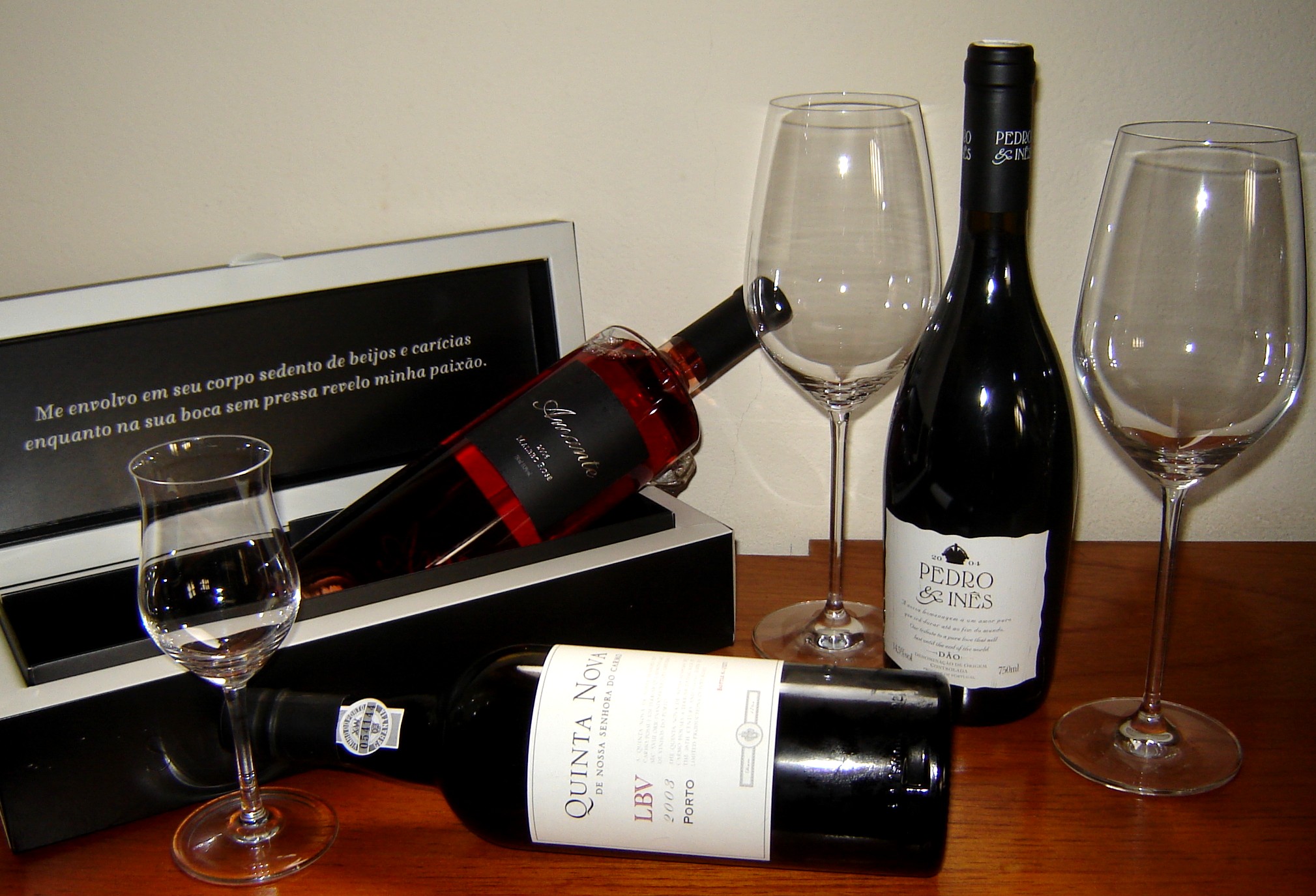 Inicie servindo como aperitivo, uma taça (ou duas) de um Rosé nacional, muito agradável e de grande frescor, de nome muito sugestivo, Amante ( Portal dos Vinhos ), produzido pela Valduga. Serve como presente também, já que a embalagem e garrafa são lindíssimas. Depois, na refeição, abra uma garrafa de Pedro & Inês (Expand), um tinto do Dão em Portugal e conte a história, para lá de romântica, de Pedro e Inês (aquela que gerou a expressão “agora não dá mais, a Inês é morta”), lembra? Não lembrou clique para ver aqui no blog. Quer finalizar com um estrondo? Sirva um cálice de um Porto Vintage (clique aqui para dicas e veja também em Boas Compras I e II) antigo, com uns 15 ou 20 anos (não tendo vá de um LBV 99, 00 ou 01 ou de um Tawny 10 anos ou ainda de um Porto Reserva) explicando que aquele néctar tem por caracteristica durar anos a fio sendo comum, vinhos de 30, 50, 80 e mais anos e quanto mais antigos melhor ficam. Aí você brinda ao amor de vocês, esperando que ele dure e evolua tanto quanto um grande Porto. Vai gastar uma nota, mas depois de tudo isso, se ainda estiver de pé, é só correr para o abraço e comemorar, sucesso garantido! Salute, e feliz dia dos namorados.