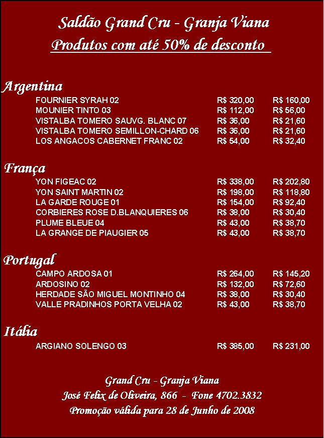 É pessoal, hoje é dia! Só informação legal chegando e tudo meio que com data e hora para acabar, daí a quantidade de posts hoje. Este é somente para dar um toque sobre um Saldão muito interessante que a Grand Cru da Granja Viana está repetindo, amanhã e Sábado, em que se destacam estes dois vinhos da região do Douro em Portugal. O Campo Ardosa eu já conheço, tomei o 2003, e é um vinho delicioso, bem intenso, de uma entrada de boca fantástica, rico, cheio, taninos aveludados e muito harmônico. Um vinho que realmente me encantou. O Ardosino eu não conheço, mas o amigo Raul Fagundes, que manja muito de vinhos, nos deixou comentário de que também é um belo vinho e uma boa compra. Para quem tiver oportunidade, passe aqui no Sábado, um monte de bons restaurantes para você conhecer e, aproveitando, compre uns vinhos para repor a adega. Veja a lista de produtos abaixo.