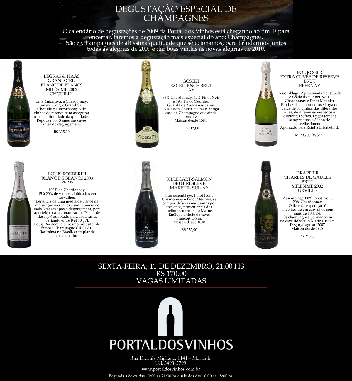 É gente, não é toda hora que aparece uma chance como esta de provar alguns dos néctares da região de Champagne. São poucas as vagas disponíveis lá na Portal dos Vinhos, então se tiver interesse não hesite e ligue logo reservando seu lugar.