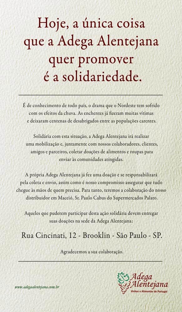 É, quando foi de Santa Catarina me manifestei aqui pleiteando ajuda via os amigos da Decanter que são de Blumenau. Agora chegou a vez do Nordeste que está mais arrasado que nunca com as enchentes e verdadeiros mares de lama que destroem tudo em seu caminho. Milhares de pessoas, que já pouco tinham, atingidos em cheio por esta verdadeira catástrofe que atinge a região. A Adega Alentejana levantou sua voz em solidariedade, mas mais que isso, tomou uma atitude através de seu representante local. Abaixo a chamada, e segue aqui meu apoio. Eu certamente passarei lá para depositar a minha contribuição em produtos essenciais a fazer frente a tamanha calamidade, e você, vai colaborar?