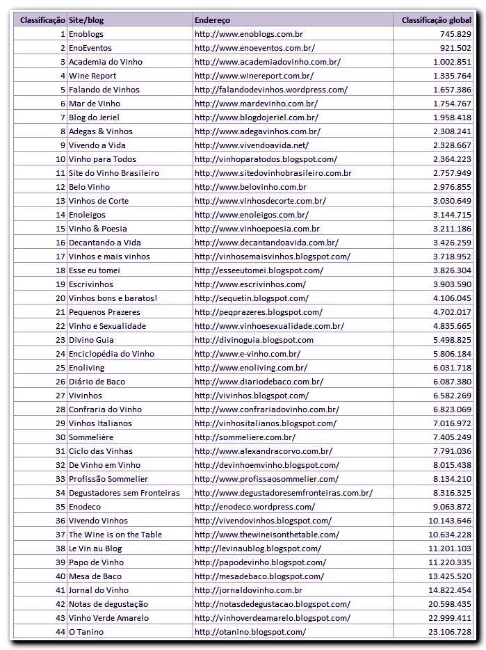 Não sou ligado nessa parafernália de redes sociais, visito meu facebook uma vez a cada duas semanas se tanto, não “twito”, mal e mal escrevo este blog quando o tempo me permite e tão pouco fico divulgando meus posts. O resultado é simplesmente o fruto de três anos de continuada atenção aos meus amigos leitores que, por sua vez, me presenteiam com seus cliques e divulgação boca a boca. Sempre soube que estava bem na fita e isso é motivo de alegria assim como de enorme satisfação, pois é o reconhecimento púbico de um trabalho que venho desenvolvendo com muito carinho. Pois bem, saber que entre mais de 25 milhões de sites/blogs no mundo inteiro o meu está entre os primeiros 7% na posição de 1.657.386 foi uma enorme e grata surpresa, mas tem mais! De acordo com o trabalho tabulado pelo Oscar no Enoventos e que vale ser lido em toda a sua abrangência clicando aqui, este blog é o primeiro colocado entre os blogs de vinho no Brasil e o quinto entre todos os blogs e sites sobre vinhos no Brasil.