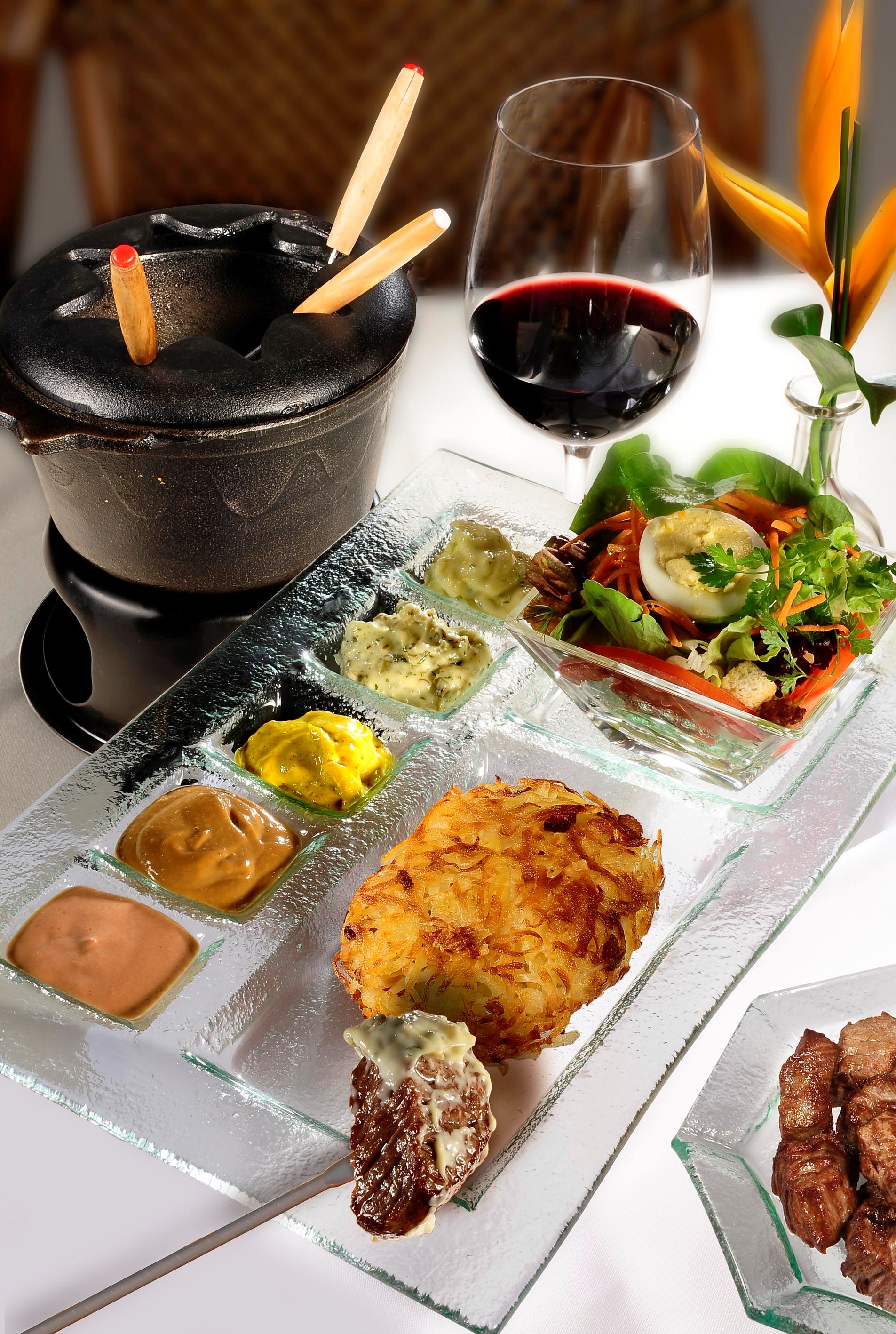 O Fondue de Camarões Crocantes é muito especial. Feito com camarão rosa empanado, ao estilo tempurá, frito no óleo da panela do fondue. Acompanha risoto parmegiano, tomate assado recheado com frutos do mar na flor de açafrão e também acompanha cinco molhos: o Shoyo; o Tartare; o Curry; o Calypso; o Raiz Forte, e um ultimo feito a base de dill (endro);