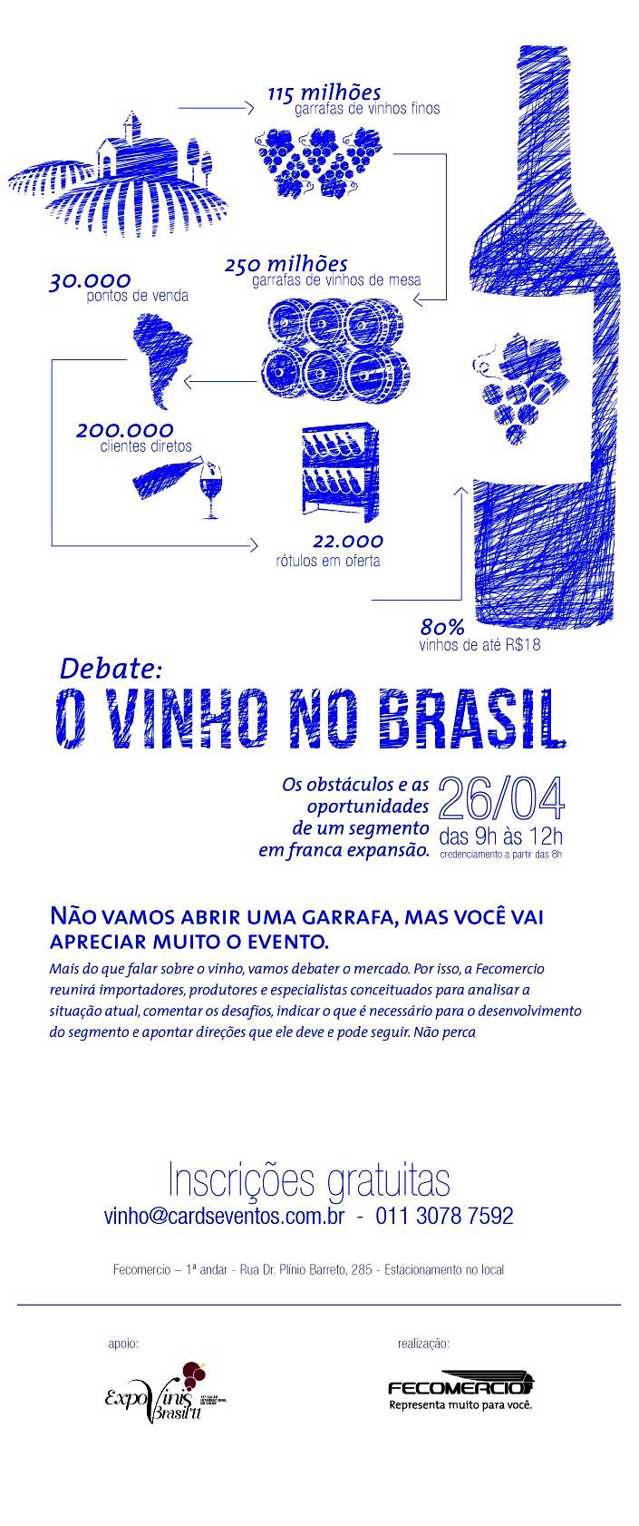 A maioria de nós, eu incluso, tende a reclamar e manter nossas opiniões discordantes, seja sobre o status quo do mundo do vinho, da produção nacional, do maledetto selo fiscal ou das mazelas que dominam Brasília, sempre entre quatro paredes. Desabafamos, mas não participamos nem tentamos mudar esse estado de coisas, é mais seguro e menos desgastante, essa é a verdade. Pois bem, desta vez temos a oportunidade nos fazer ouvir e saber ao vivo e a cores, o que anda acontecendo em nossa vinosfera tupiniquim. Não é sempre que temos esta oportunidade, porém neste próximo dia 26, uma pena que o local seja de tão difícil acesso nessa hora da manhã, temos um encontro marcado para debater o vinho no Brasil, participe e faça já a sua reserva!