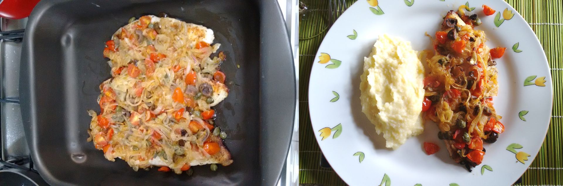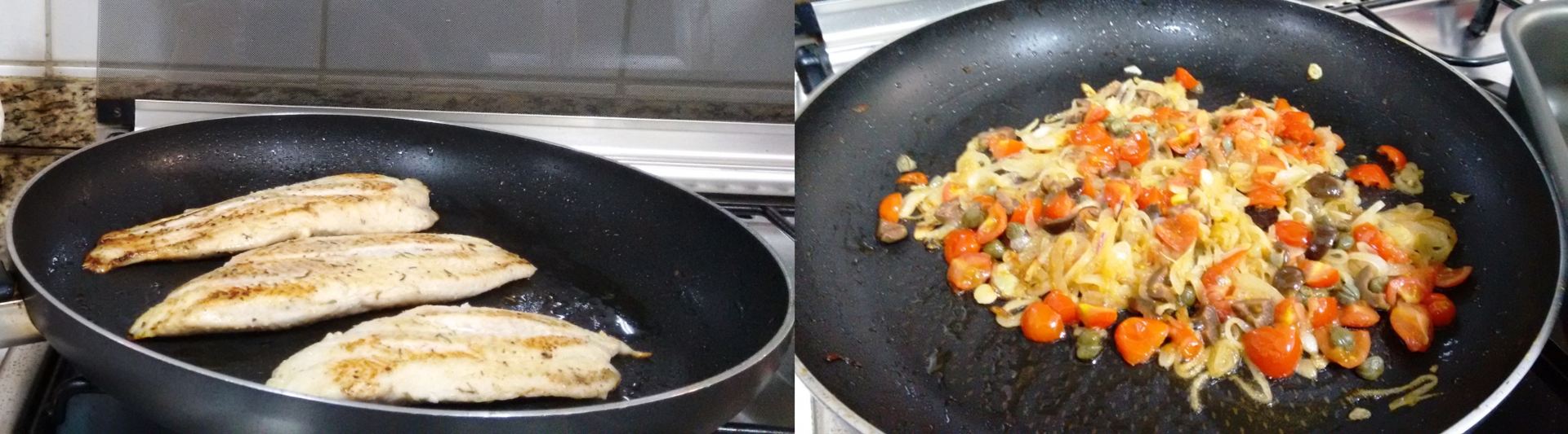 Desta feita vou dar o passo a passo desta gostosa receita para quem estiver a fins, não requer grande habilidade, afinal, se eu que sou um zé mané na cozinha consigo,qualquer um consegue e é bastante rápido. Para duas ou três pessoas, separe dois ou três filés de pintado, uma cebola média fatiada fina,um dente de alho picado fino, umas oito azeitonas picadas, dez a doze tomatinhos cereja cortados em pedaços pequenos, 3 colheres de chá de alcaparra. Tempere os filés a gosto, eu uso um pouco de sal, pimenta branca moída na hora, um pouco de suco de limão, um fiozinho de vinho branco e uma pitada de tomilho. Deixe marinar uma meia hora. Enquanto isso prepare os outros ingredientes.