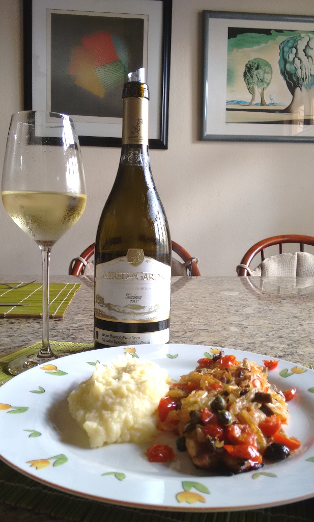 Neste Domingo, a sós com minha loira, decidi preparar um prato que qualquer cozinheiro meia boca, tipo euzinho aqui, pode fazer e se dar bem! Para acompanhar já tinha img_20161106_144348376separado minha última garrafa de Abreu Garcia Chardonnay que, lamentavelmente, terei que esperar um bom tempo até ter outra para tomar e vender, porque a safra não deu este ano devido a pésssimas condições climáticas e a de 2015 esgotou. Sou fã deste vinho sem madeira nenhuma, melhor que o amadeirado deles que acho excessivo, e de bom preço (R$60) que me dá especial prazer por seu equilíbrio sem perder a tipicidade do que se espera de um bom chardonnay. Já falei dele aqui quando o harmonizei com Fondue de Queijo, mas desta feita optei por acompanhá-lo com filé de Pintado coberto por um refogado (super simples de executar) de cebola, alho, tomate cereja, azeitona preta portuguesa e um punhado de alcaparras, acompanhado de purê de batata, ficou da hora!